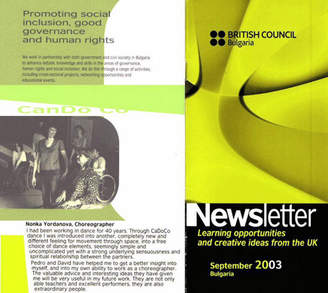A part of the letter of Nonka Yordanova, the choreographer of the Dancing Wheels Formation for Integrate Dance addressed to the British Council after the workshop carried out by CandoCo Dance Company in Sofia where the Formation took part.